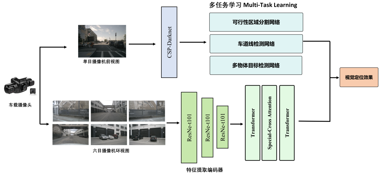 The proposed method has demonstrated excellent experimental results on challenging autonomous driving datasets such as nuScenes, Talk2Car, Argoverse, and BDD100K, proving the effectiveness of the network architecture. Specifically, the object detection module achieved a 12% increase in accuracy and a 10.2% reduction in parameters compared to state-of-the-art (SOTA) models. The semantic localization module reached a detection score of 72.7, improving accuracy by 13.8% over SOTA models. Experiments on the BDD100K dataset showed a 7.9% and 3.6% improvement in average precision for lane detection and object detection, respectively, compared to existing SOTA models.
