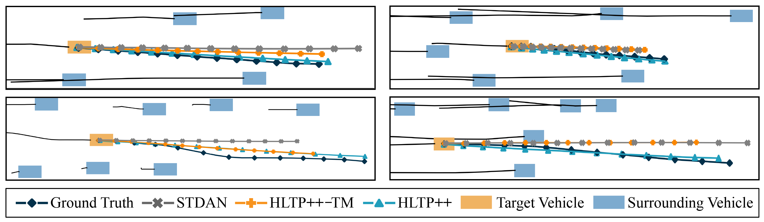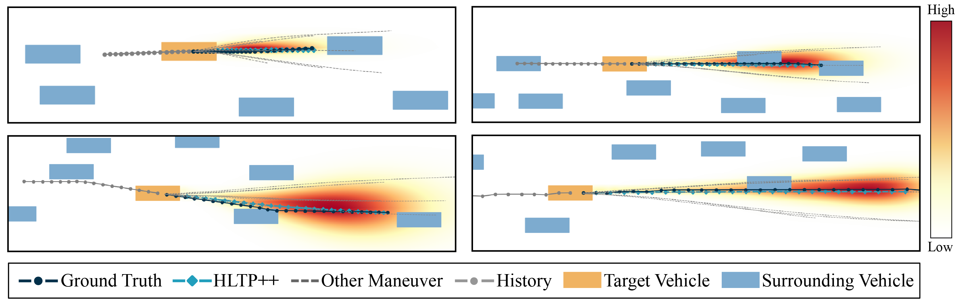 Figure showcases the multimodal probabilistic prediction performance of HLTP++ on the NGSIM dataset. The heat maps shown represent the Gaussian Mixture Model of predictions in challenging scenes. These visualizations show that the highest probability predictions of our model are very close to the ground truth, indicating its impressive performance. Moreover, the figure visually demonstrates our model's ability to accurately predict complex scenarios such as merging and lane changing, confirming its effectiveness and safety in various traffic situations. Interestingly, in certain complex scenarios, the trajectory predictions of the ``student'' model exceed the accuracy of the ``teacher'' model. This result illustrates the ability of the ``student'' model to selectively assimilate and refine the knowledge acquired from the ``teacher'' model, effectively ``extracting the essence and discarding the dross''. Moreover, we observed that vehicles in closer proximity to the target vehicle received higher attention values. This observation aligns with the driving behavior of human operators who primarily focus on the vehicle ahead, as it has the most significant influence on the driving trajectory. This also substantiates the utility of vision pooling in reducing the perturbations caused by neighboring vehicles, thereby prioritizing the significance of the leading vehicle.