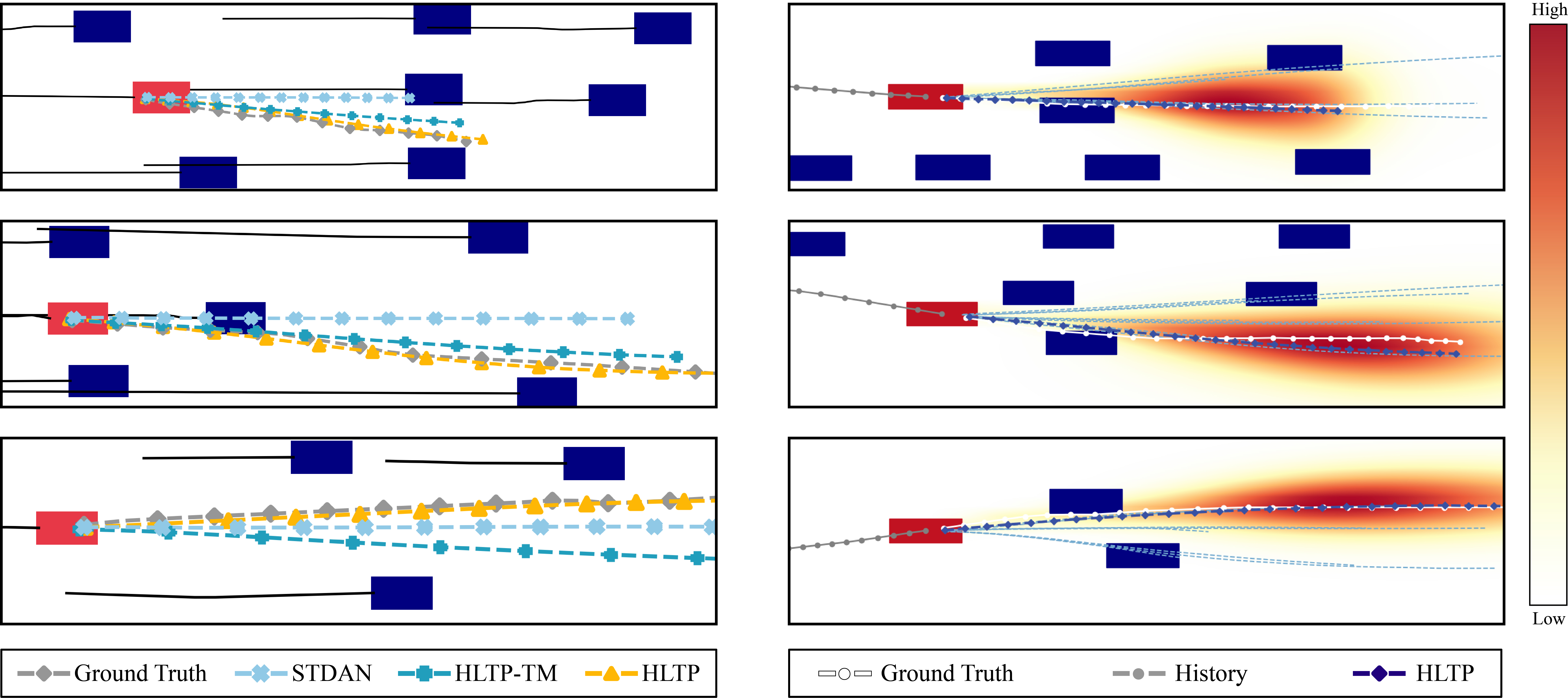 Figure showcases the multimodal probabilistic prediction performance of HLTP on the NGSIM dataset, and the velocities of the target vehicle and its surrounding vehicles. The heat maps shown represent the Gaussian Mixture Model of predictions in challenging scenes. These visualizations show that the highest probability predictions of our model are very close to the ground truth, indicating its impressive performance. Additionally, it also visually demonstrates our model's ability to accurately predict complex scenarios such as merging and lane changing, confirming its effectiveness in various traffic situations.